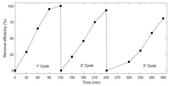 Recyclability of the photocatalyst represents one of the most important advantages of a heterogeneous application. Thus, the recyclability of the synthesized material was evaluated by using H2O2 to activate the process for multiple cycles. Figure 8 shows three cycles of the RhB removal using the H2O2-hybrid organic-inorganic perovskite system irradiated under visible light. It can be seen that after 3 cycles, the system showed a stable and effective catalytic activity on the removal of the selected dye, and the activity loss was negligible. RhB degradation efficiency showed slight decrease from 93% to 80% after 120 min of the third treatment. The results obtained may be caused by active sites saturation. Moreover, the recycle was performed in series, thus a slight decrease in photocatalyst content should be considered. It must be mentioned that the main aim of the former study is to investigate the potential of HOIPs in photocatalytic processes. Further development on material and process technology should be applied.