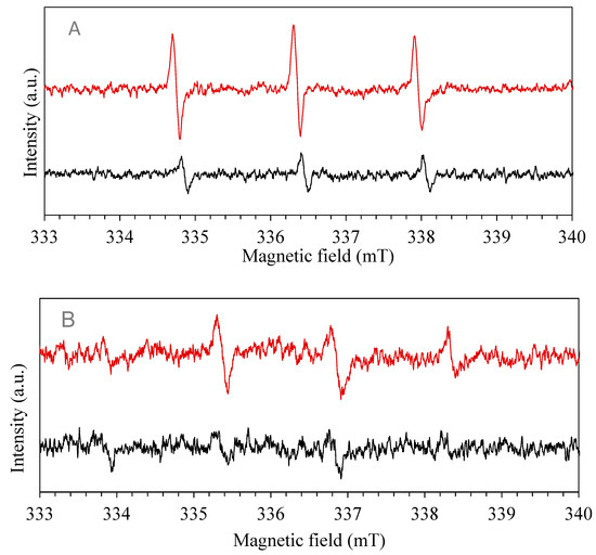 Electron paramagnetic resonance (EPR) spectra using as spin-trap: (A) TEMP, red for 5 min, black for 30 min; (B) DMPO, red for 5 min, black for 30 min.