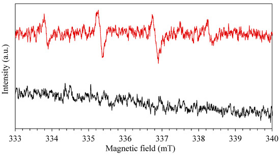 EPR spectra using DMPO as spin-trap in presence of RhB, red with catalyst and black without catalyst.