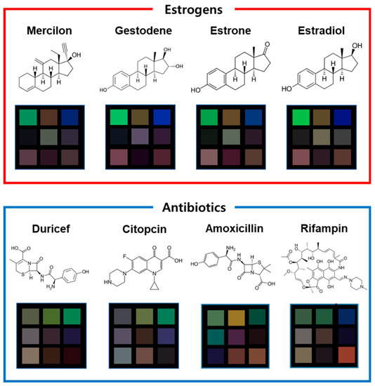 Four types of estrogen drugs and four types of antibiotics were purchased from Sigma-Aldrich (Seoul, South Korea) and a local pharmacy (Medipharm, Busan, South Korea), ground, and used directly. In real-world situations, all such analytes exist in various physical conditions that cause molecules to vibrate or diffuse. To mimic these kinds of physical conditions, sensing experiments were carried out at four different temperatures (30, 60, 90, and 120 °C) for each material.
