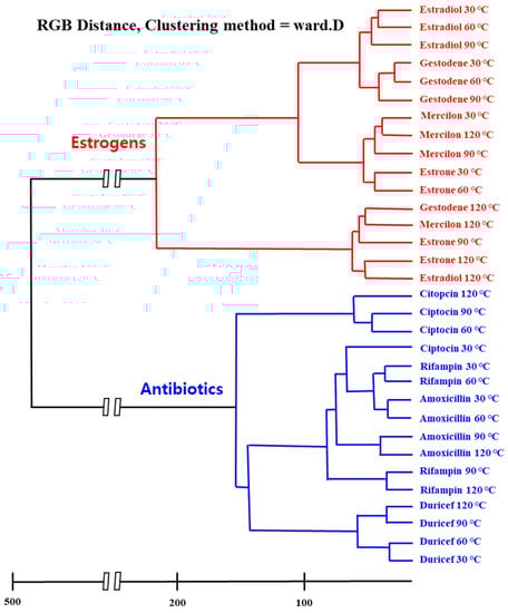 Figure 1 depicts a schematic illustration of the M13 bacteriophage-based multi-array sensor chip and color-pattern analysis process. The multi-array sensor chip shows specific color patterns according to the applied materials due to the different chemical groups expressed on the M13 bacteriophage. Furthermore, microstructures of colorimetric sensors determined by the pulling speed contribute to the color change, owing to their different surface-to-volume ratios [7,8,10,18]. After collecting the color patterns, a statistical analysis process determines the types of unknown substances. Figure 2 displays the specific color patterns toward each target chemical at a temperature of 120 °C. The specific color patterns were generated by calculating pixel differentiation between initial color and color after exposure to the target chemical. As shown in Figure 2, the M13 bacteriophage-based sensor array displays specific color change according to the exposed chemicals. However, because this was a qualitative analysis, there were limitations in the exact classification of the target chemicals. The M13 bacteriophage-based sensor array, different from specialized sensors such as litmus paper or a pregnancy tester, is a non-specific sensor system, which means small amounts of color changes should be analyzed and classified exactly. Signal detection and data analysis by the sensor of the drug component are based on the inherent chemical properties of the material. The analysis of female hormone-related drugs, antibiotic components, and their clustering tendencies were analyzed through various features. Through the RGB distance values, the Euclidean distance was set to the RGB distance, and a hierarchical classification was performed using the Ward Linkage (Ward.D) method [20] (see Figure 3). The similarity between two clusters was measured on the basis of the increment of the error sum of squares (ESS) when two clusters were combined. The increase of ESS was measured as the distance between two clusters when the distance matrix was obtained. This method was less sensitive to noise or outlier data than the Single Linkage Method [20]. The clustering results showed a close relationship with each chemical composition. They confirmed that estrogen-based drugs and antibiotics-based drugs can be classified within a large frame and partially. In particular, the similar chemical structures of antibiotic substances made their distances very close to each other. Their vapor pressure values are similar to each-other at various temperatures, and these compounds react comparably with sensor array chips. The similar composition of the pharmaceutical forms containing each compound also had an impact.