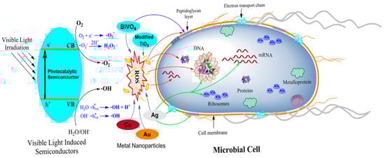 The possible mechanisms of antibacterial activities exhibited by different metal nanoparticles (NPs) and photocatalytic semiconductors. The activation of the photocatalytic semiconductor by visible light is depicted on the left-hand side of the figure. Reactive oxygen species created by various semiconductors destruct bacterial cell components, as indicated by red arrows. Ag, Cu, and Au nanoparticles also generate reactive oxygen species (ROS) for bacterial killing. The green arrow represents targets of Ag. Reproduced with permission from []. Copyright Frontiers, 2018.