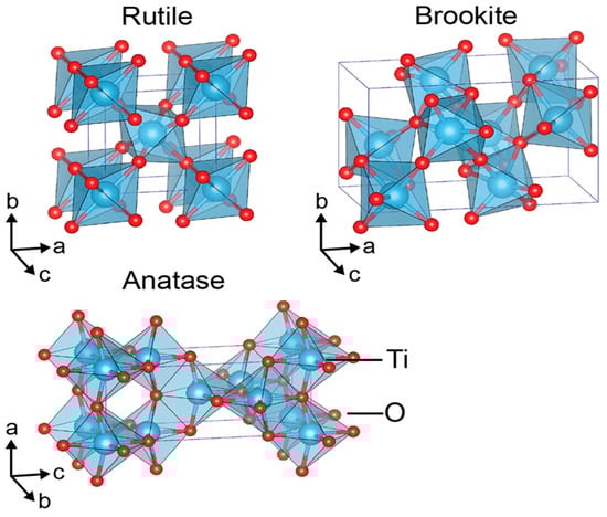 Connecting the chains of distorted TiO6 octahedra by sharing edges and corners in different ways to form rutile, brookite and anatase polymorphs. Titanium atoms are blue; oxygen atoms are red. Reproduced with permission from []. Copyright Nature Publishing Group, 2017.