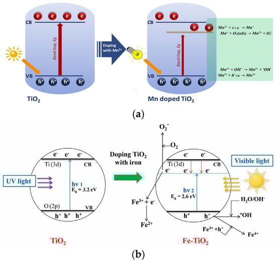 The charge transfer processes between excited electrons from the valence band of TiO2 with (a) Mn2+ ions of Mn-doped TiO2, and (b) Fe3+ ions of Fe-doped TiO2. CB and VB are the conduction and valence bands of TiO2, respectively. Reproduced with permission from [,], respectively. Copyright Elsevier, 2017; Copyright American Chemical Society, 2013.