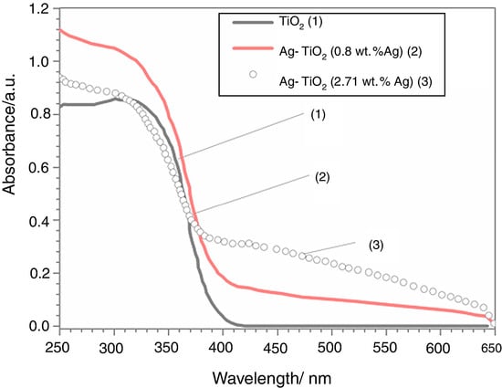 Employing plasmonic NPs on semiconductors is considered to be effective in improving their photocatalytic performance. In this respect, noble metal NPs act as electron donors for titania by injecting hot electrons into the conduction band of TiO2 under visible light []. The holes created in plasmonic AgNPs can capture conduction electrons of TiO2, thereby reducing the charge recombination in titania. Therefore, plasmonic oscillation from Au and Ag nanoparticles to TiO2 under visible light has received considerable attention in recent years [,,,,,]. Moreover, AgNPs with well-established antibacterial properties are particularly attractive dopants for titatia in addition to their LSPR effect []. Figure 4 shows the UV-visible spectra of pristine TiO2 and Ag/TiO2 nanocomposites with different AgNP contents []. Pristine TiO2 exhibits a strong UV light absorption band due to the excitation of the electron–hole pair across the bandgap. The Ag/TiO2 nanocomposites display higher absorption values in the UV region, and the absorption intensity increases with increasing AgNP concentrations. The introduction of AgNPs into TiO2 results in an increase in the absorption towards the visible light region, i.e., 400–650 nm wavelength. This arises from the LSPR effect of AgNPs that promotes the absorption of Ag/TiO2 nanocomposites in the visible regime.