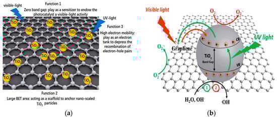 Schematics displaying the (a) roles of graphene layers of graphene/TiO2 composite in photocatalysis, and (b) charge transfer mechanism under ultraviolet or visible light irradiation. Reproduced with permission from [,], respectively. Copyright MDPI, 2018 and 2017.
