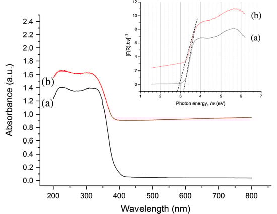 UV–vis diffuse reflectance spectra of (a) anatase TiO2 and (b) nanostructured rGO/TiO2. Inset: plot of transformed KM function [F(R).hv]1/2 vs. hv for bandgap determination of anatase TiO2 and rGO/TiO2; R is reflectance and hv is photon energy. Reproduced with permission from []. Copyright Springer, 2013.
