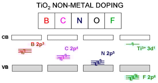Metal doping has some drawbacks for enhancing the visible light response of titania. These include transition metals of high contents, which may serve as recombination sites for photogenerated charge carriers, the low thermal stability of photocatalysts, the formation of secondary phases and dopant insolubility [,,]. Therefore, significant improvement in the photocatalytic performance of metal-doped titania can be achieved only at a low metal dopant concentration. Above an optimal dopant content, photocatalytic activity decreases owing to a higher recombination rate of charge carriers. Non-metal elements such as carbon, nitrogen and boron, with an atomic radius close to that of the O atom, can be utilized as anionic dopants for replacing lattice oxygen anions [,,,,,,,]. In this respect, non-metal doping appears to be an alternative route for enhancing visible light efficiency, due to the introduction of a new valence band associated with their localized 2p states lying above the valence band of TiO2 (Figure 8). As such, non-metal doping generates a hybridization of O-2p and N-2p orbitals, giving rise to an upshift in the valence band position. By irradiating with visible light, electrons are excited from the localized N-2p states to the CB, leaving behind holes on the localized states. The exception is fluorine with the highest electronegativity, having filled states below the O-2p valence band, leading to the formation of Ti3+ ions as of result of the charge compensation [].