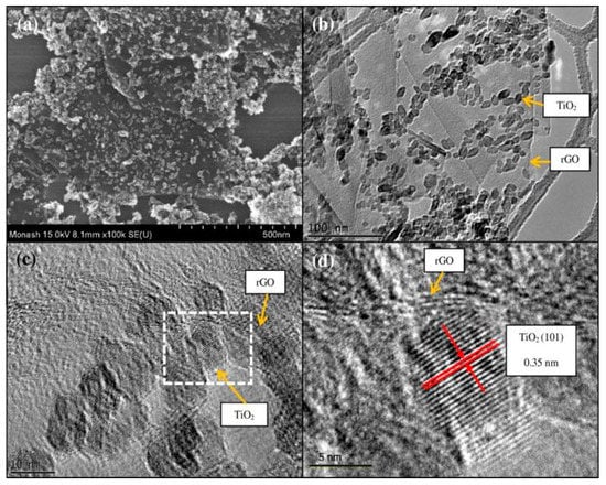 For preparing rGO/TiO2 nanocomposite, Tan et al. first obtained a mixed solution of tetrabutyl titanate, ethylene glycol and acetic acid, and then added it dropwise into a chilled GO solution under vigorous stirring. Thereafter, an autoclave filled with the GO–TiO2 solution was heated at 180 °C for 8 h. The greyish-black precipitate was obtained by centrifugation []. During the solvothermal synthesis, GO was reduced to rGO accordingly. Figure 10a,b show the respective field-emission scanning electron microscopic (FESEM) image and transmission electron micrograph (TEM) of the rGO/TiO2 nanocomposite. It is apparent that titania nanoparticles with an average size of 12 nm are dispersed and anchored on the rGO surface. The high-resolution TEM (HRTEM) images of a selected rGO-TiO2 heterojunction are shown in Figure 10c,d. The lattice fringes can be seen in titania nanoparticles, especially in the high magnification image shown in Figure 10d, implying that the TiO2 nanocrystals exhibit good crystallinity. The lattice spacing of TiO2 is determined to be 0.35 nm, which corresponds to the (101) plane of anatase TiO2. Moreover, the rGO–TiO2 interface is clean and free from the impurity products. The intimate connection enables photoinduced electrons to flow readily from rGO to TiO2 NPs, thereby enhancing the photocatalytic activity.