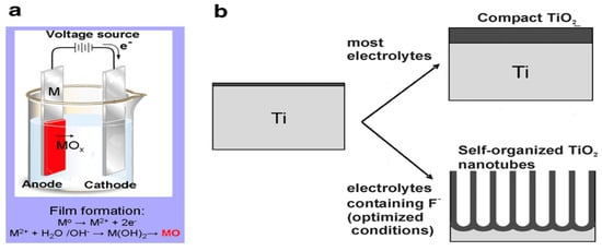 Titanium anodization can be simply performed in a two-electrode cell system connected to a power supply (Figure 11a). The oxide film formation involves an anodic oxidation of metal at the metal surface, outward migration of Ti4+ ions toward the metal/oxide interface and field-assisted dissolution of oxide at the oxide/electrolyte interface []. The oxide layer generally has a low conductivity, which restricts the migration of oxygen and Ti ions accordingly. As such, continued oxide growth is assisted by an electric field, and a compact oxide layer is formed on the Ti surface. The electrochemical reactions occurring during anodization are given as follows