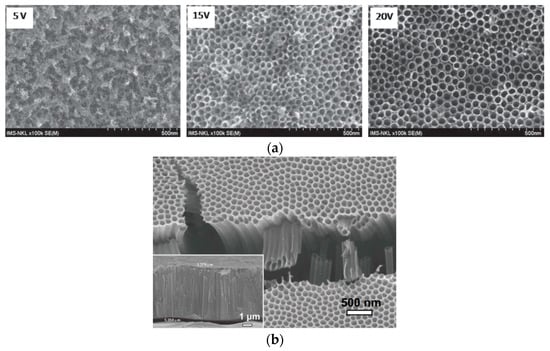 (a) Top-view scanning electron micrographs of TNT arrays prepared by anodizing Ti in a mixed ethylene glycol/NH4F and water solution under applied voltages of 5, 15 and 20 V for 5 h. Reproduced with permission from []. Copyright IOP Publishing, 2014. (b) Cross-sectional SEM image (inset) and top view of TNTs fabricated by anodizing Ti in a mixed ethylene glycol/NH4F and water solution at 30 V for 1 h. Reproduced with permission from []. Copyright MDPI, 2019.