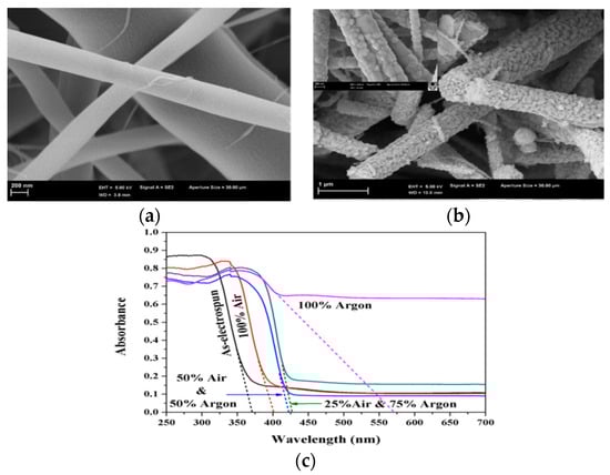 Scanning electron micrographs of (a) electrospun titania nanofibers before heating, and (b) after heating in 100% argon atmosphere at 900 °C. (c) UV-visible spectra of as-spun titania nanofibers without calcination, and with calcination at 900 °C in 100% air, 50% air–50% argon, 25% air–75% argon and 100% argon. Reproduced with permission from []. Copyright Elsevier, 2016.