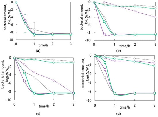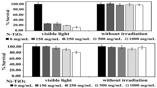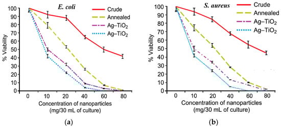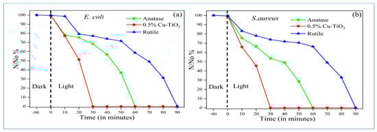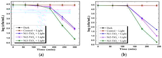 Yadav et al. fabricated Ni-doped TiO2 NPs using the sol-gel process through the addition of NiSO4(H2O)6 to a mixture solution containing TTIP, acetic acid and sodium dodecyl sulfate. The resulting powders were dried and calcined at 500 °C for 5 h []. Figure 16a,b shows the photocatalytic bactericidal activity against E. coli and S. aureus of Ni-doped TiO2 NPs with 1.0 mol %, 2.0 mol % and 3.0 mol % Ni dopants, denoting Ni1–TiO2, Ni2–TiO2 and Ni3–TiO2, respectively. In dark (with doped TiO2 NPs) and visible light (without doped TiO2 NPs) environments, both bacterial strains grow into a high density of cell populations, expressed as colony-forming units (CFU)/mL. The photocatalytic inactivation of E. coli and S. aureus takes place by illuminating Ni-doped TiO2 NPs with visible light. The Ni3–TiO2 sample shows the highest photocatalytic inactivation because it can generate a higher ROS level with an increase in Ni content. Moreover, the photocatalytic inactivation efficiency of Ni-doped TiO2 NPs toward Gram-positive S. aureus is somewhat faster than Gram negative E. coli. In the case of Gram-negative salmonella abony, complete inactivation takes 360 min of light irradiation (data not shown). The time required for the full inactivation of S. abony is higher than that for E. coli inactivation. Using the same approach, they also fabricated Cu-doped TiO2 NPs with 1.0 mol %, 2.0 mol % and 3.0 mol % Cu by adding different concentrations of CuSO4·5H2O to a solution containing TTIP and acetic acid. The catalysts were calcined in air at 500 °C for 5 h []. The 3%Cu/TiO2 NPs photocatalyst exhibits a higher bactericidal activity than those doped with 1.0 mol %, and 2.0 mol % Cu. The 3%Cu/TiO2 NPs catalyst shows 100% inhibition for S. aureus within 120 min, but it requires 240 min for the complete inactivation of E. coli. This implies that the rate of bacterial inactivation for E. coli is much slower than for S. aureus. This is caused by a difference in the cell wall structures between these two bacterial strains. As is known, bacteria exhibit a negative charge on their cell wall surface. The cell wall of Gram-positive bacteria is relatively porous and thick (20–80 nm) consisting of several layers of peptidoglycan, interspersed with teichoic and lipoteichoic acids. Peptidoglycan is negatively charged due to the presence of carboxyl and amino groups []. In contrast, the cell wall of Gram-negative bacteria is thinner (<10 nm) with a single peptidoglycan layer, surrounded by an outer membrane with a very complex structure. Lipopolysaccharides (LPS) and lipoproteins are located in the outer leaflet, while phospholipids are found in the inner leaflet of the outer membrane. The phosphate groups of LPS increase the overall negative charge. Thus Gram-negative bacteria have a higher negative charge than Gram-positive bacteria [,,]. The structural variations in the cell walls between these two bacterial strains lead to their different interactions with photocatalysts. As such, Gram-negative bacteria is more resistant to attack from the superoxide anion and hydroxy radical with a negative charge. Moreover, LPS also creates a permeability barrier at the cell surface, thus contributing to its resistance against many antibiotics and substances [,,].