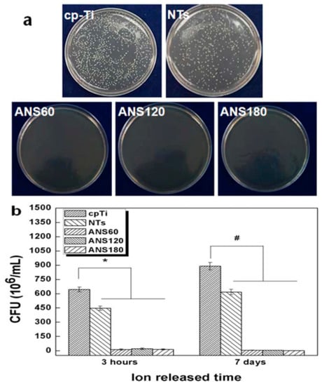 - Uhm, S.H.; Song, D.H.; Kwon, J.S.; Lee, S.B.; Han, J.G.; Kim, K.N. Tailoring of antibacterial Ag nanostructures on TiO2 nanotube layers by magnetron sputtering. J. Biomed. Mater. Res. Part B 2014, 102, 592–603. [Google Scholar] [CrossRef]