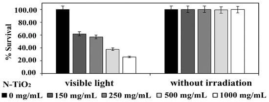 Titania NPs are negatively charged at the point of zero charge (pzc) at pH = 6.2. Therefore, they exhibit low bactericidal activity in neutral and alkaline solutions by repelling negatively charged bacteria in the absence of light. At acidic pH, positively charged TiO2 NPs strongly interact with the bacterial cells, resulting in bacterial membrane penetration and inducing oxidative damage accordingly []. Kiwi et al. reported that TiO2 NPs tend to kill E. coli by direct contact in the dark condition, thus damaging their cell walls, due to the electrostatic attraction between the TiO2 NPs and the negatively charged bacterial cell wall at a pH close to but below pzc []. On the contrary, the bactericidal effect is caused by the creation of ROS species on the TiO2 NPs under UV irradiation. This means that the bactericidal activity is due to the radiation itself and is not caused by the titania NPs []. TiO2 NPs can kill multidrug-resistant bacteria such as MRSA, vancomycin-resistant Enterococcus faecalis (VRE) and P. aeruginosa through the reactive radicals generated by electron–hole pairs upon UV excitation [,]. The photocatalytic inactivation of MRSA and VRE strains depends on the power and irradiation time of UV-A light []. Therefore, the disinfection process requires a high-power UV source to excite TiO2 NPs. Apparently, TiO2 NPs do not reach their full potential for bactericidal applications owing to their ineffective photoexcitation under visible light irradiation. As a result, TiO2 NPs have limited efficiency against microorganisms in indoor environments where the fraction of UV light is small. From this perspective, the development of a visible-light active TiO2 with excellent antibacterial performance is of crucial importance in medical and industrial sectors.