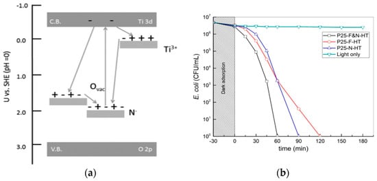 The VB of titania is composed of hybridized states of O-2p and Ti-3d orbitals, while the CB consists of primarily Ti-3d orbitals. The electronic and optical properties of titania can be modified by doping. In this context, titanium or oxygen ions’ sites of titania lattice can be substituted with either metal or nonmetal dopants to alter their optical and photocatalytic properties. The cationic doping of titania with transition metals, rare earth metals and noble metals is typically used to improve its photocatalytic performance under visible light excitation. The presence of metal ion dopants can alter the charge transfer properties of TiO2, thus improving the separation efficiency of photogenerated carriers, and producing a shift in its absorption edge to the visible regime. The dopant energy level is located below the CB of TiO2, acting as an electron or hole trap, and thus allowing more carriers to transport to the surface. The photocatalytic activity of metal-doped titania depends on several factors, including the dopant concentration, type of metal dopant, d-electron configuration and energy band level of dopant in the titania lattice []. Although metal dopants facilitate a red shift in optical absorption edges of titania, they can induce defect states, acting as carrier recombination centers, especially at very high dopant contents. Thus, the occurrence of a rapid recombination rate of photogenerated charge carriers arises from a reduction in the distance between the trapping sites by increasing the number of dopant ions.