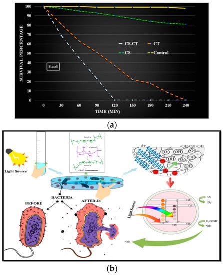 - Raut, A.V.; Yadav, H.M.; Gnanamani, A.; Pushpavanam, S.; Pawar, S.H. Synthesis and characterization of chitosan-TiO2: Cu nanocomposite and their enhanced antimicrobial activity with visible light. Colloids Surf. B 2011, 148, 566–575. [Google Scholar] [CrossRef] [PubMed]