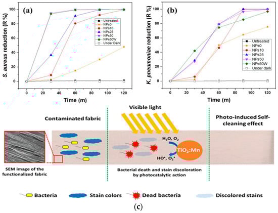 - Zahid, M.; Papadopoulou, E.L.; Suarato, G.; Binas, V.D.; Kiriakidis, G.; Gounaki, I.; Moira, O.; Venieri, D.; Bayer, I.S.; Athanassiou, A. Fabrication of visible light-induced antibacterial and self-cleaning cotton fabrics using manganese doped TiO2 nanoparticles. ACS Appl. Bio Mater. 2018, 1, 1154–1164. [Google Scholar] [CrossRef]