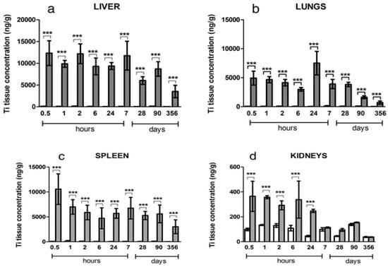- Heringa, M.B.; Peters, R.J.B.; Bleys, R.L.A.; van der Lee, M.K.; Tromp, P.C.; van Kesteren, P.C.; van Eijkeren, J.C.; Undas, A.K.; Oomen, A.G.; Bouwmeester, H. Detection of titanium particles in human liver and spleen and possible health implications. Part. Fibre Toxicol. 2018, 15, 15. [Google Scholar] [CrossRef]