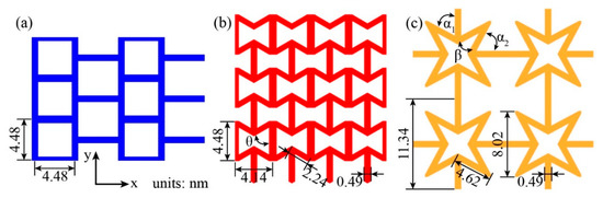 Three kirigami structures, square kirigami model (SKG), reentrant hexagonal honeycomb (RHH), and quadrilateral star structure (QSS), were considered in the present study. As shown in Figure 1, the geometer parameters are also labeled.