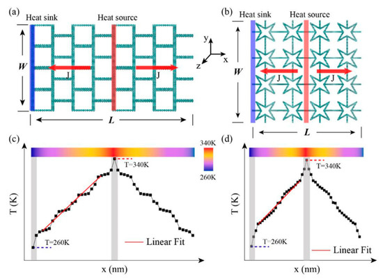 where A is the cross-sectional area of heat transfer and ∂T/∂L denotes the temperature gradient after the system reaches non-equilibrium steady state (see Figure 2c,d). The factor 2 represents the fact that the heat flux transports in two directions away from the heat source. The thickness of model was assumed to be the interlayer equilibrium spacing of graphene (0.34 nm) [25,26].