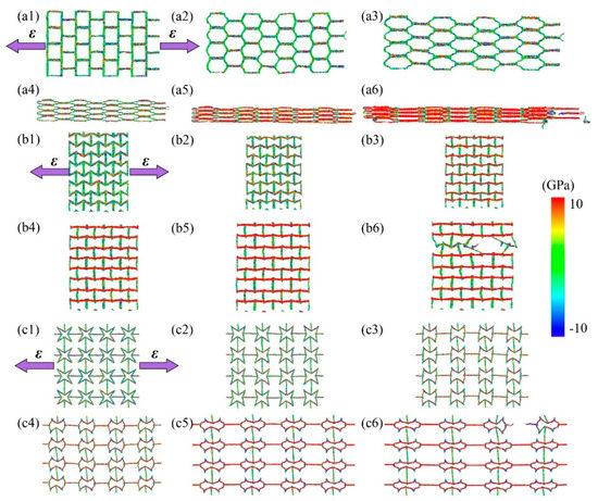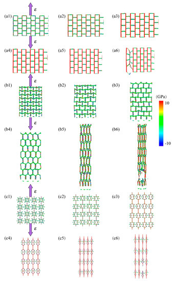 Configuration deformation and stress distribution of KGSs for system under tensile loading along the x-direction. (a1–a6) is process of the SKG’s model deformation and stress distribution under tensile loading. (b1–b6) is process of the RHH’s model deformation and stress distribution under tensile loading. (c1–c6) is process of the QSS’s model deformation and stress distribution under tensile loading.