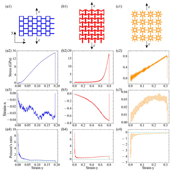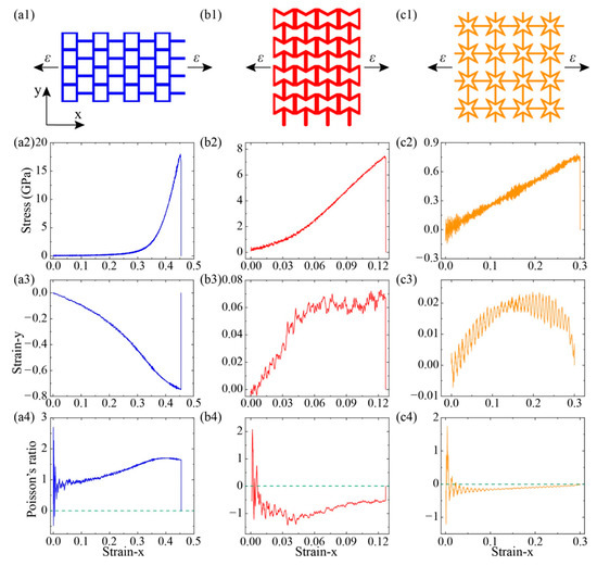 Mechanical properties of three KGSs are explored by conducting tensile loading along the y-direction (a1–c1). The relationships of stress–strain (σ–ε) (a2–c2), strain–strain (εx–εy) (a3–c3), and Poisson’s ratio–strain (v–ε) (a4–c4) are plotted.