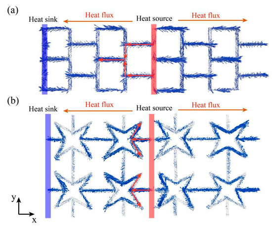 To clarify the reduction mechanism of the thermal conductivity and study the difference between KGS and pristine graphene in thermal transport, the spatial distributions of the heat flux on each atom in SKG and QSS were calculated. The micro heat flux was extensively used in describing the thermal transfer properties of low-dimensional materials. The atomic heat flux is defined as: Ji = eivi − sivi, where ei, vi, and si represents the energy, velocity vector, and stress tensor of atom i, respectively [36]. When the system reaches non-equilibrium steady state, the atomic heat flux will be calculated and averaged over 2 ns. As shown in Figure 7, the global heat flux labeled by red rows transferred from the heat source to the heat sink. The vector arrows labeled by blue rows show the migration and loss of heat flux as well as phonon scattering around the vacancy regions. Similar to the defect effect [33,34,35,36,37], the phonon scattering occurs when heat flux passes through a vacancy barrier, which results in the reduction of the thermal conductivity. Especially for the QSS model (see Figure 7b), the transfer direction of partial vector rows was opposite to that of global heat flux.