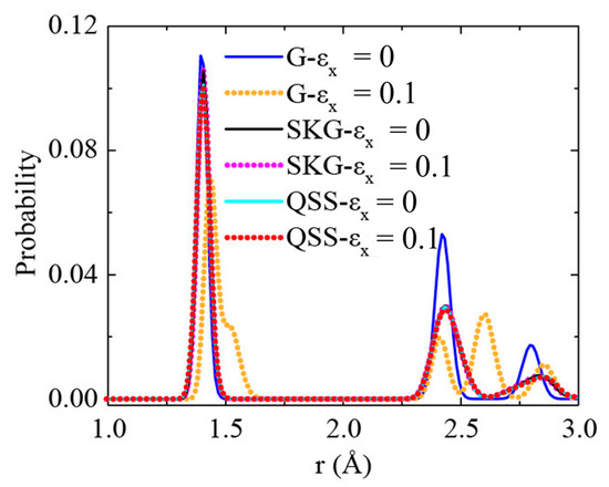 We computed the radial distribution function (RDF) of the SKG and QSS models to get the atomic deformation. The results of graphene were also plotted for comparison (see Figure 8). The first peak at 0.14 nm was observed in graphene, SKG, and QSS at the strain-free state. It suggests the C–C bond length was 0.14 nm in average [38,39].