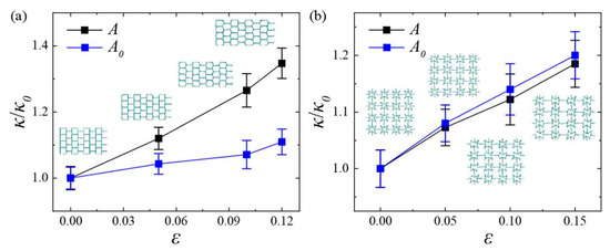 Relative thermal conductivity of (a) SKG and (b) QSS models in the x direction as a function of uniaxial tensile strain. A (A0) represents actual (initial) cross-section area with (without) considering the variation of lateral area.