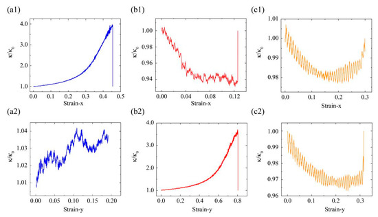The variation of κ/κ0, 1/(1–v × εl), in these GKS models (QSS, RHH, and SKG) under various uniaxial tensile strains along x- (a1–a3) and y-directions (b1–b3), respectively.