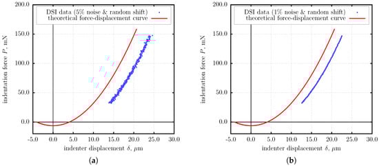 Numerical simulation. The theoretical force-displacement curve (solid line) and an example data sets simulating DSI readings (dots, shifted). (a) High noise scenario. (b) Low noise scenario.