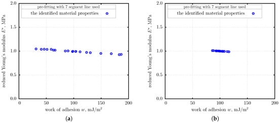 Methods of solution of such problems are well developed (see e.g., [,]). As long as the optimal values of the characteristic parameters and are found, the sought material parameters and w can be readily evaluated from them, because the characteristic parameters are known expressions that are defined within the framework of the chosen theory of adhesive contact.