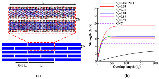 Here we use the results obtained in prior sections for theoretical evaluation of optimum design of nanopapers from CNT-wrapped cellulose (shown in Figure 11a). Previous studies on the microstructure of some biological materials such as nacre, bone, and teeth suggested that staggered (brick-and-mortar) arrangement of high-aspect ratio fibers (shown in Figure 11a) increases stiffness, strength, and toughness simultaneously [1,70]. In staggered arrangement design, in addition to interfacial properties between fibers and mechanical properties of the fiber, the value of overlap length for stress transfer between fibers play a crucial role [47,48]. Previous studies revealed that 50% overlap length in an optimum design maximizing the mechanical properties such as stiffness and strength [71]. According to shear-lag-model analytical relationships for strength and elastic modulus based on continuum shear-lag model have been proposed [72]: