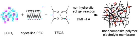 Figure 1 schematically shows the in situ synthesis of SiO2 nanoparticle-filled PEO-LiClO4 nanocomposite polymer electrolyte membranes. We prepared the nanocomposite polymer electrolytes through a classical non-hydrolytic sol gel reaction [41]. This reaction scheme was first used with a simple silicon alkoxide, i.e., TEOS. FA was used as a catalyst to create the oxide nanofillers. Unlike other hydrolysis reactions, this method is well-suited for the synthesis of oxide nanoparticles without changing the pH of the solution. The reactive by-products only included trace ethanol and water, but not deionized water, which eliminates the need for the time-consuming and energy-intensive drying process [40,42]. Moreover, TEOS, FA, LiClO4 and PEO are soluble in a single solvent, such as DMF, at elevated temperatures above the melting point of PEO, such as 60 °C, thereby leading to the infinite miscibility of the precursor fillers in the PEO network and homogeneous distribution of the nanofillers in the PEO matrix. At this point, a semi-transparent and stable resin was obtained after sufficient stirring, and cast on a PTFE sheet. A free-standing, transparent and flexible nanocomposite polymer electrolyte membrane was obtained after a careful drying process. It should be noted that the as-prepared membranes were stored in an inert glovebox for at least one week before any characterization to remove trace water and complete the recrystallization dynamics. Liu and Lin et al. previously described similar materials, viz. PEO-LiTf/LiClO4-SiO2 composites [40,43]. PEO has many advantages, such as a high capability of dissolving lithium salts, good stability towards lithium metal anode, easy processability, low toxicity, and low cost etc. These advantages make PEO a popular material system. Our work is different from their work. Liu et al. developed the PEO-SiO2 composite polymer electrolyte through simultaneous formation of the polymer matrix and the inorganic particles. Their work emphasized the polymer matrix formed by ultraviolet irradiation of a PEO macromer concurrent with addition of SiO2 nanoparticles. The synthesis process was relatively complicated, the SiO2 nanoparticles were not fully in situ addition, and the polymerization reaction was also not easy to control. By contrast, in our work, the SiO2 nanoparticles were in situ formed in the PEO matrix, and high-molecular-weight PEO (1,000,000 g mol−1) was selected. In both Liu and Lin’s work, the formation of SiO2 nanoparticles were via a hydrolysis reaction (addition of TEOS to deionized water). On the contrary, we prepared the nanocomposite polymer electrolytes through a non-hydrolytic sol gel reaction. The reactive by-products only included trace ethanol and water, but not deionized water, which eliminates the need for the time-consuming and energy-intensive drying process. We think these are the advantages of our approach over other in situ approaches for SiO2 in PEO.