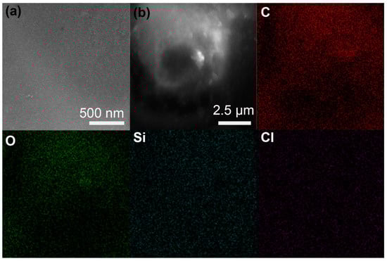 (a) Scanning electron microscope (SEM) image. (b) Energy-dispersive spectroscopy (EDS) elemental mapping images of the nanocomposite polymer electrolyte membrane. (C, O, Si, Cl) EDS elemental map of the membrane showing distribution of C, O, Si, Cl, respectively.