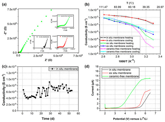 As shown in Figure 3a, the EIS of the nanocomposite polymer electrolyte membrane (in situ membrane) was acquired to determine the ionic conductivity at 30 °C. The ionic conductivities of the composite polymer electrolyte (ex situ membrane) and ceramic-free polymer electrolyte (ceramic-free membrane) membranes were provided as a comparison. It was found in Figure 3a that the EIS of the membranes was similar. The EIS consists of an incomplete high-frequency semicircle, which represents the ionic impedance of the polymer electrolytes, and a straight-line in the low-frequency region, which is ascribed to the bulk effect of the blocking electrodes. The ionic conductivity of the in situ membrane was around ~1.1 × 10−4 S cm−1 at 30 °C; whereas, the ex situ membrane and ceramic-free membrane exhibited ionic conductivities of 9.1 × 10−7 S cm−1 and 7.1 × 10−8 S cm−1 at 30 °C, respectively, which agrees well with previous results [40]. In particular, the in situ non-hydrolytic sol gel reaction significantly enhanced the ionic conductivity by approximately two orders of magnitude compared with that of the ex situ membrane and three orders of magnitude compared with that of the ceramic-free membrane.