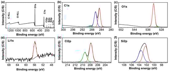 X-ray photoelectron spectroscopy (XPS) spectra of the in situ synthesized nanocomposite polymer electrolyte membrane: (a) XPS spectra, (b) C 1s spectrum, (c) O 1s spectrum, (d) Li 1s spectrum, (e) Cl 2p spectrum, and (f) Si 2p spectrum.