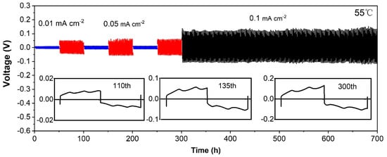 Galvanostatic cycling measurements of Li/in situ membrane/Li symmetrical cells at various current densities and 55 °C.