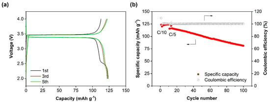 To test the nanocomposite polymer electrolyte membrane, a solid battery was built with LiFePO4 as the cathode, the in situ membrane as the electrolyte, and the Li metal as the anode. The battery was charged to 4 V and discharged to 2 V at 55 °C. As shown in Figure 6a, the cell exhibited a typical potential plateau of 3.38 V and 3.47 V, representing the discharge/charge potential plateau of LiFePO4 at 0.1 C, respectively. The initial discharge capacity was 123.5 mAh g−1, which is 72.6% of the theoretical capacity (170 mAh g−1). The relatively low reversible capacity may be a result of the low conductivity of the electrolyte membrane and the large interfacial resistances. As shown in Figure 6b, the specific capacity of Li/in situ membrane/LiFePO4 cells increased slightly during the initial 10–20 cycles, due mainly to the improved contact and conductivity between PEO, filler and active material after repetitive Li-ion diffusion [55,56]. In the subsequent cycles at 0.2 C, the Li/in situ membrane/LiFePO4 cell suffered from a progressive decrease in the specific capacity. The discharge capacity was 81 mAh g−1 after 90 cycles at 0.2 C, corresponding to 70% of the initial capacity at 0.2 C. Other groups also reported capacity decays upon cycling for the Li/LiFePO4 cells using PEO-based composite polymer electrolytes, probably owing to the large volume change and destructive interfacial contact [38]. The Coulombic efficiency of the battery was kept at >99.0% throughout the cycling.