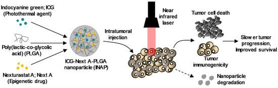 Premised on these studies, we utilized PLGA nanoparticles to co-encapsulate and administer photothermal therapy (PTT) and epigenetic therapy as a novel combination therapy for melanoma. We encapsulated indocyanine green (ICG), a US FDA-approved photoactive dye as the PTT agent, and Nexturastat A (NextA), an epigenetic drug, within PLGA nanoparticles, generating ICG-NextA-PLGA nanoparticles (INAPs) to co-administer PTT and epigenetic therapy. PTT is an effective method for localized tumor ablation using light-responsive nanoparticles and a wavelength-matched light source. Typically, near infrared (NIR) light-responsive nanoparticles, including nanoparticles containing ICG, are illuminated with an NIR laser generating heat, which triggers tumor cell death [18]. Previous studies have demonstrated that PTT can increase tumor immunogenicity, elicit immunogenic cell death, and be combined with immunological adjuvants (e.g., toll-like receptor agonists) or immunotherapies (e.g., checkpoint inhibitors) to treat cancer [19,20,21,22]. However, PTT alone is not sufficient to generate effective systemic antitumor immunity. To complement the effects of PTT, we co-encapsulated the epigenetic drug NextA, a histone deacetylase (HDAC) 6 inhibitor, within the PLGA nanoparticle.
