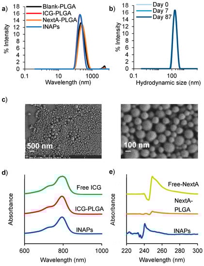 Characterization of INAPs demonstrate high stability and co-encapsulation of ICG and NextA. (a) Size distributions (hydrodynamic diameters) of INAPs, NextA-PLGA, ICG-PLGA, and Blank-PLGA measured by dynamic light scattering (DLS) ranged from 220 to 255 nm. (b) Multi-day stability of INAPs over 87 days as measured by DLS. (c) Scanning electron microscope images of INAPs at high magnification (50,000×, curr 13 pA), zoomed out (left) and zoomed in (right). UV-Vis-NIR spectrometry measured the absorption peaks of (d) ICG (free agent; green) at 780 nm and (e) NextA (free agent; gold) at 250 nm to determine the presence of ICG in ICG-PLGA (red) and INAPs (blue), and NextA in NextA-PLGA (orange) and INAPs (blue). INAPs, ICG-PLGA, and NextA-PLGA spectra were normalized to Blank-PLGA spectra.