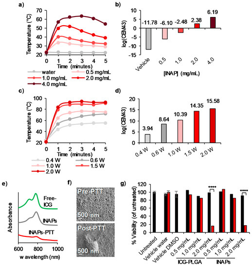 The photothermal heating of INAPs decreases melanoma cell viability in vitro. (a) Time–temperature heating curves at 1-min intervals and (b) Thermal doses expressed in log(CEM43) of varying concentrations of INAPs (0.5–4 mg/mL) exposed to a 0.8 W NIR laser for 5 min demonstrate concentration-dependent heating. (c) Time–temperature heating curves at 1-min intervals and (d) thermal doses expressed in log(CEM43) of 4 mg/mL INAPs exposed to varying NIR laser powers (0.4–2 W) for 5 min demonstrate laser power-dependent heating. (e) UV-Vis-NIR spectroscopy of free ICG (green), INAPs before (gray), and after (red) exposure to 0.8 W NIR laser for 5 min show lower ICG presence. (f) SEM images of INAPs show changes in INAP morphology before (Pre-PTT, mag. 50,000×, curr 25 pA) and after (Post-PTT, mag. 50,000×, curr 13 pA) exposure to a 0.8 W NIR laser for 5 min. (g) SM1 melanoma cells were suspended in PBS and treated with INAPs or ICG-PLGA at varying concentrations or controls in the presence (red) or absence (black) of the laser. Cells were subsequently re-plated in media and incubated at 37 °C for 24 h, after which the Cell Titer-Glo ATP assay was performed and determined a decrease of the SM1 cell viability in the presence of the laser.