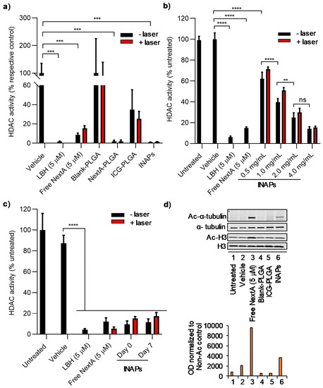 The NextA encapsulated within PLGA nanoparticles (INAPs and NextA-PLGA) retained their ability to inhibit pan-HDAC activity (Figure 4a). This finding is consistent with earlier published reports where encapsulated agents in PLGA particles were shown to work similarly to or better than free agents (Table S3) [4,7,8,9]. Critically, the activity of NextA was not diminished even in the presence of NIR laser activation, suggesting the compatibility of administering NextA with ICG-based PTT. The INAPs were able to exhibit concentration-dependent (Figure 4b) and temporal (Figure 4c) inhibition of HDAC activity, once again, both in the presence or absence of the NIR laser. The INAPs were able to inhibit HDAC6-specific activity as evidenced by the increased expression of Ac-α-tubulin in melanoma cells in vitro relative to controls (Figure 4d and Figure S6). The findings in Figure 3 and Figure 4 provide evidence for the use of PLGA nanoparticles to co-localize complementary therapies, such as PTT and epigenetic therapy, and is consistent with earlier studies using PLGA to co-localize therapies (Table S3) [22,42].