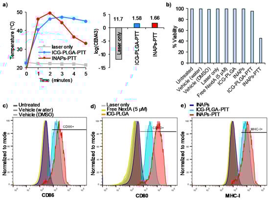 In these studies, the melanoma cells were resuspended in PBS (200 µL) and treated with 2.0 mg/mL of INAPs or ICG-PLGA in the presence or absence of an NIR laser at 0.4 W for 5 min. Other controls included untreated, vehicle (water), vehicle (DMSO), and free NextA (5 µM). After 24 h of incubation post-treatment, the supernatants and cells were collected and rinsed with PBS at least twice. The cells were then resuspended in 200 µL of PBS containing 1 µL of Zombie VioletTM/GreenTM/AquaTM fixable viability kit and incubated at 4 °C for 20 min in the dark. Next, the cells were rinsed with PBS, collected at 400× g for 3 min, and then resuspended in 100 µL of flow buffer (1% FBS in 1 × PBS) containing 5 µL of mouse Fc blocking buffer and incubated for another 10 min. After cells were washed and collected, cells were resuspended in flow buffer containing flow antibodies (1 µL PE-CD86, 1 µL AlexaFluor647-CD80, 1 µL AlexaFluor 488-H-2kb) in 100 µL, and incubated for 1 h. Cells were then washed and resuspended in 200 µL of flow buffer and then stored at 4 °C overnight. Samples were run on a Celesta Cell Analyzer with HTS (BD BioSciences, Franklin Lakes, NJ, USA) and the analysis was conducted on a FlowJoTM v10.6.1. Respective fluorescence minus one (FMO) controls were used for gating analysis. UltraComp beads from Thermo Fisher Scientific were used for single fluorophore controls (compensation controls).