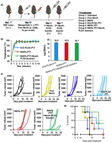 To evaluate the therapeutic efficacy of combining PTT with epigenetic therapy, we conducted a preliminary study in a syngeneic murine melanoma model. Specifically, mice bearing established (tumor volumes ~60 mm3) SM1 melanoma tumors were divided into the following five groups (n = 5 per group; Figure 6a): (1) Untreated—receiving no treatment; (2) NextA (i.p., 25 mg/kg)—receiving free NextA (epigenetic therapy) 6× per week through the entire study until the tumor exceeded 20 mm in any dimension; (3) INAPs (i.t., 50 mg/kg)—receiving i.t. encapsulated NextA (epigenetic therapy); (4) ICG-PLGA-PTT (i.t., 50 mg/kg + NIR laser for 10 min)—receiving PTT; (5) INAPs-PTT (i.t., 50 mg/kg +NIR laser for 10 min)—receiving both PTT and epigenetic therapy; and (6) INAPs-PTT (i.t., 50 mg/kg + NIR laser for 10 min) + 2 NextA-PLGA boosters (i.t. 50 mg/kg)—receiving both PTT and epigenetic therapy. Group 6 received NextA-PLGA boosters to maintain sufficient concentrations of NextA within the tumor microenvironment (TME) to complement the effects of PTT. Additionally, the dosing for free NextA in group 2 was based on the optimal doses previously determined to elicit antitumor activity [23,24,25]. The average final tumor temperature achieved during PTT measured by the thermal imaging camera was ~95°C and the corresponding thermal doses were ~16.8 log(CEM43) (Figure 6b). Groups receiving epigenetic therapy alone in free drug (NextA; yellow) or encapsulated drug (INAP; blue) form showed similar tumor growth curves to untreated tumor-bearing mice (Figure 6c). Importantly, nearly daily systemic administration of free NextA conferred no tumor progression benefit compared to untreated controls. By comparison, groups receiving PTT (ICG-PLGA-PTT; light blue) and PTT plus epigenetic therapy (INAPs-PTT + NextA-PLGA boosters; red) exhibited markedly slower tumor progression (Figure 6c). This sustained pressure of epigenetic therapy after PTT in the INAPs-PTT + NextA-PLGA boosters group also delayed the rate of tumor recurrence in treated mice (Table 1), which was not evident after only one INAPs injection without NextA-PLGA boosters as observed in the INAPs-PTT group. Treatment with ICG-PLGA-PTT and INAPs-PTT (for both the INAPs-PTT group and INAPs-PTT + NextA-PLGA booster group) effectively ablated the SM1 tumors on tumor-bearing mice, as the treated mice for each of these groups presented no tumor on day 1 post treatment (indicated by “no tumor” in Table 2). When the tumor progression in the INAPs-PTT-treated and INAPs-PTT + NextA-PLGA boosters-treated mice were compared to that of the ICG-PLGA-PTT-treated mice (Table 2), the sustained NextA pressure by the NextA-PLGA boosters caused a slower tumor progression compared to INAPs-PTT up until day 11. This was evident, for example, by day 8, where tumors in the INAPs-PTT + NextA-PLGA booster-treated group had an average tumor volume of only 19% that of the ICG-PLGA-PTT-treated group. In contrast, on the same day (day 8), this slower tumor growth was not evident in INAPs-PTT-treated mice as their tumor volumes were on average 156% that of ICG-PLGA-PTT-treated mice, indicating that INAPs-PTT tumors were on average 56% larger than ICG-PLGA-PTT tumors. At day 18 (9 days after the last NextA-PLGA booster), the benefit of controlling the tumor size with the sustained epigenetic therapy was no longer observed, as the tumor volume of the INAPs-PTT + NextA-PLGA booster group was 105% of that of the ICG-PLGA-PTT group, indicating that by day 18, tumors of the INAPs-PTT + NextA-PLGA booster group were on average 5% larger than in the ICG-PLGA-PTT group. Further, in terms of survival, there was no survival benefit observed in the tumor-bearing animals treated with free NextA or INAPs relative to untreated controls. However, all animals treated with PTT exhibited an increased median survival relative to untreated controls. The median survival was 18 days in the INAPs-PTT plus NextA-PLGA boosters group, 17 days in the ICG-PLGA-PTT, and 14 days in the untreated controls (Figure 6d), although there was no statistically significant differences in the long-term survival between the treatment groups. Overall, this preliminary study suggests that PTT combines with epigenetic therapy to slow tumor progression early after treatment and improves median survival in a syngeneic melanoma model.
