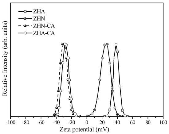 Zeta potential distribution of ZHN, ZHA, ZHN–CA, and ZHA–CA materials.