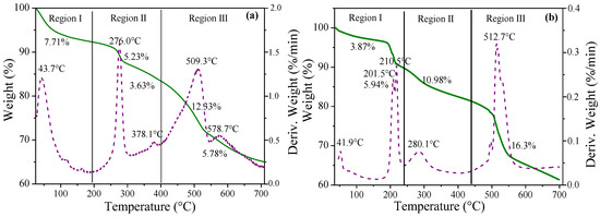 For ZHA–CA, the thermal decomposition revealed that the total mass loss value was 37.09% upon heating at 700 °C, which was slightly higher than that of ZHN–CA. In the first region (I), a mass loss of 3.87% is associated with the removal of physiosorbed water molecules [19]. The peaks at 201.5, 210.5, and 280.1 °C, in the derivative analysis, are associated with the beginning of the dehydroxylation process, as well as the decomposition of the organic species, which is evidenced with a mass loss of 16.92%. The third region had a sharp peak with a mass loss of 16.30% at 512.7 °C, which can be associated with the decomposition of the immobilized organic species (CA). From the results, the hybrid material ZHN–CA showed a thermal stability of 65.5 °C higher than that of the ZHA–CA, since the start of the dehydroxylation process was delayed.