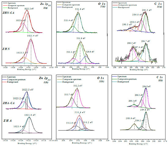 High-resolution XPS of chemical state (1) Zn 2p3/2, (2) O 1s, and (3) C 1s for (a) ZHN and ZHN–CA, and (b) ZHA and ZHA–CA.