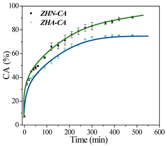The CA release profiles of ZHN–CA and ZHA–CA in pH 7.1 buffer solution are given in Figure 8. For ZHN–CA, a faster release of CA was reached in comparison to the hybrid compound ZHA–CA. The CA released amount was about ~80% in 300 min for ZHN–CA, whereas only ~66% was released for ZHA–CA. These results reveal differences in the interactions between the organic anions and the layers of the two host matrices, ZHA and ZHN. As a result, there was a stronger coordination bonding between carboxylate groups of the caffeate anions with the ZHA than that with the ZHN, in concordance with the analysis of interfacial characterization made in the previous section (Section 3.2). Therefore, the release process was slower and more restricted than that for ZHN–AC. For ZHA–CA, the release behavior achieved an equilibrium after 420 min with ~74%, whereas, for ZHN–CA, 480 min were necessary with ~95% release. The results indicate that the hybrid compounds have potential use as controlled release systems.
